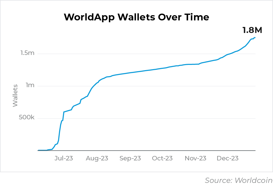 Worldcoin is creating a digital identification system called World ID. World ID aims to verify the authenticity of online content or interaction through the blockchain. It represents a potential solution for the proliferation of bots and deepfakes. As of November 2023, Worldcoin had 1M+ active users and 4M+ downloads from dozens of countries.