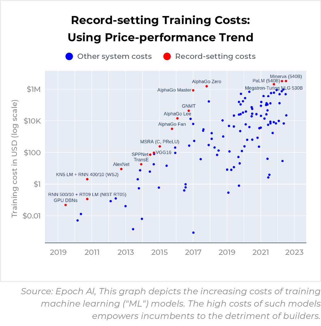 Centralization risk of the Large Language Model (LLM) market: There is a significant risk that AI’s capital-intensive nature could concentrate power among a few players owning massive data facilities. A few winners in the AI market could charge prohibitive fees or make it hard for users and developers to switch to other providers.