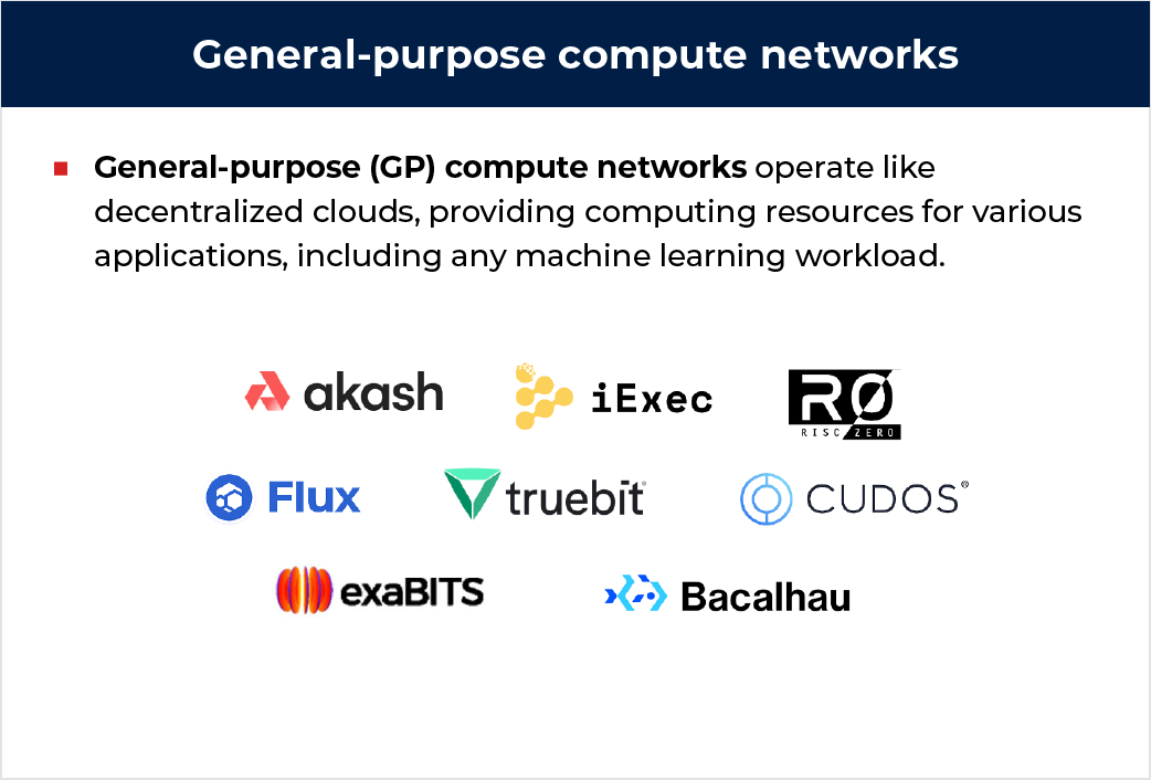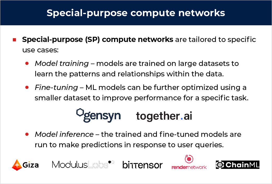 Decentralized compute networks are represented by general-purpose networks, operating like a decentralized cloud (e.g., Akash), and special-purpose decentralized compute networks, solving for specific use cases: model, fine-tuning or inference (e.g., Gensyn, Gyza, Modulus Labs, ChainML).
