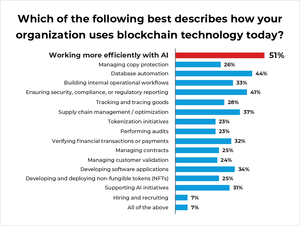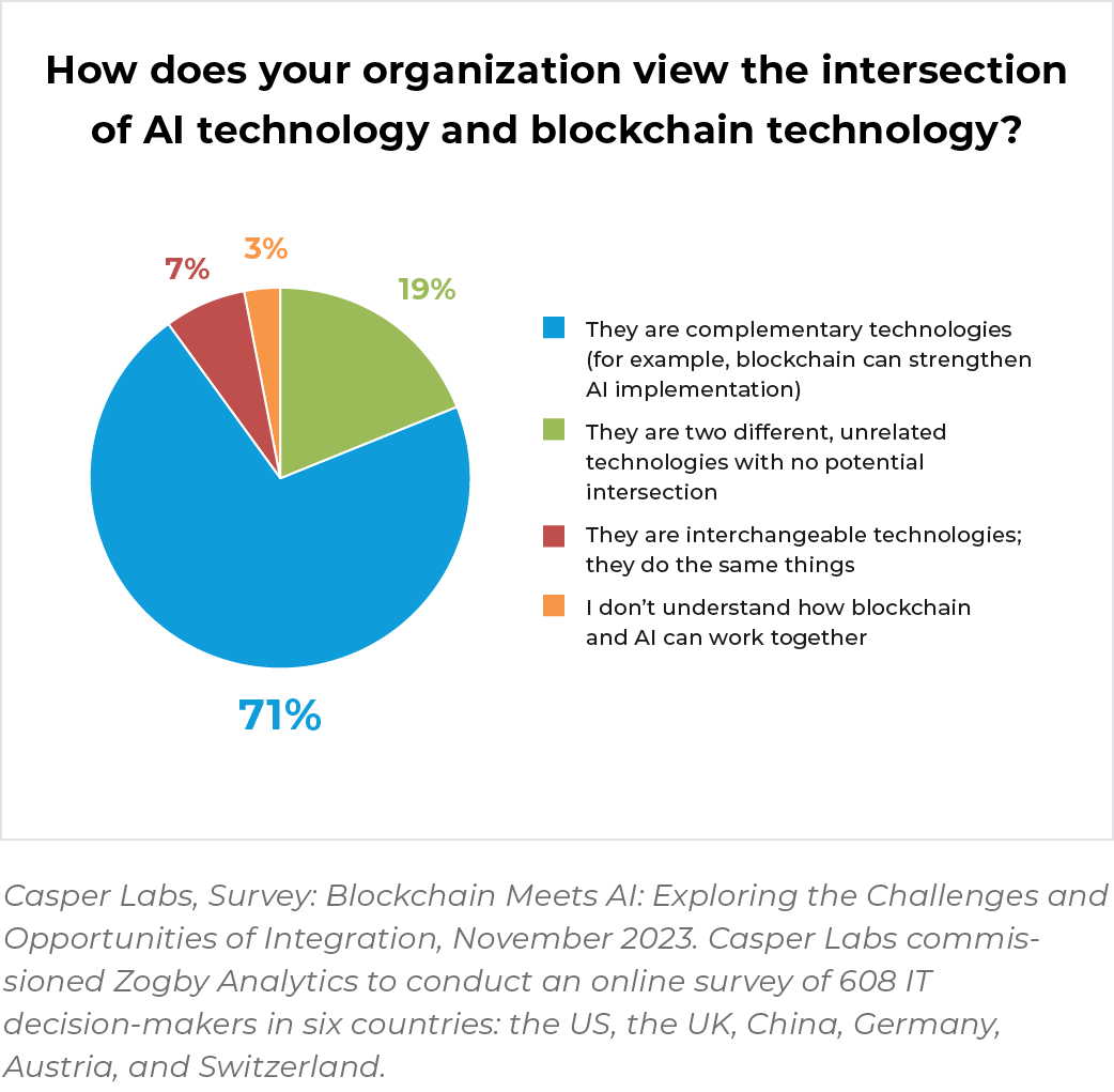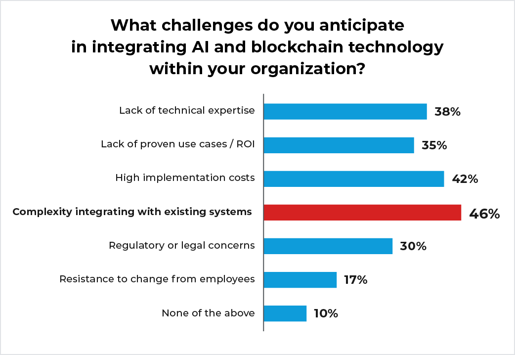 Compatibility issues: AI relies on data stored and processed in centralized servers or cloud platforms, while blockchain is a decentralized node network that stores and verifies transactions in encrypted blocks. Complexity integrating with existing systems is by far the most prevalent concern about implementing blockchain and AI technology.