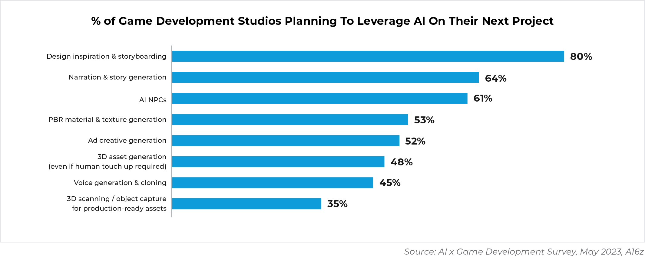According to an A16z survey, 87% of gaming studios already use an AI tool or model, and 99% of studios plan to use AI in the future.2