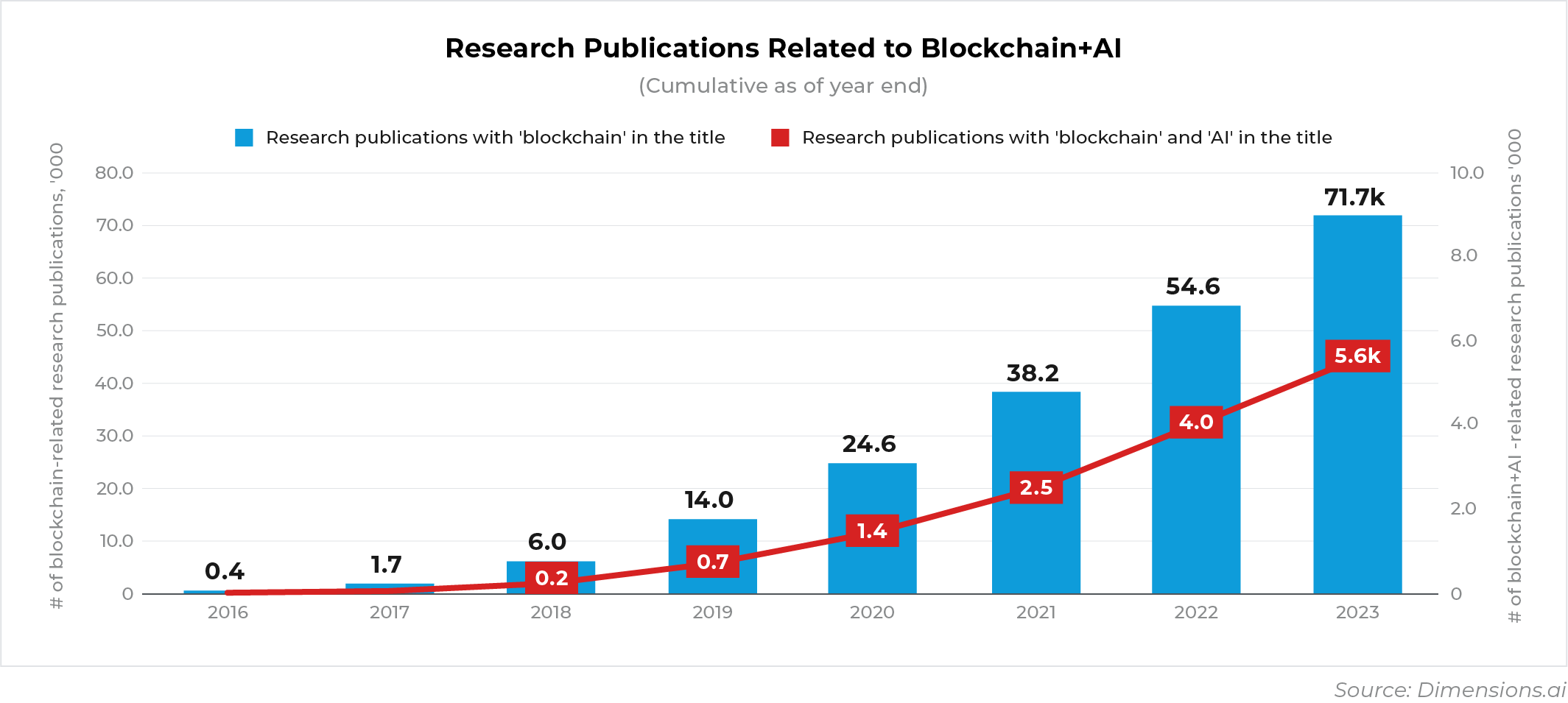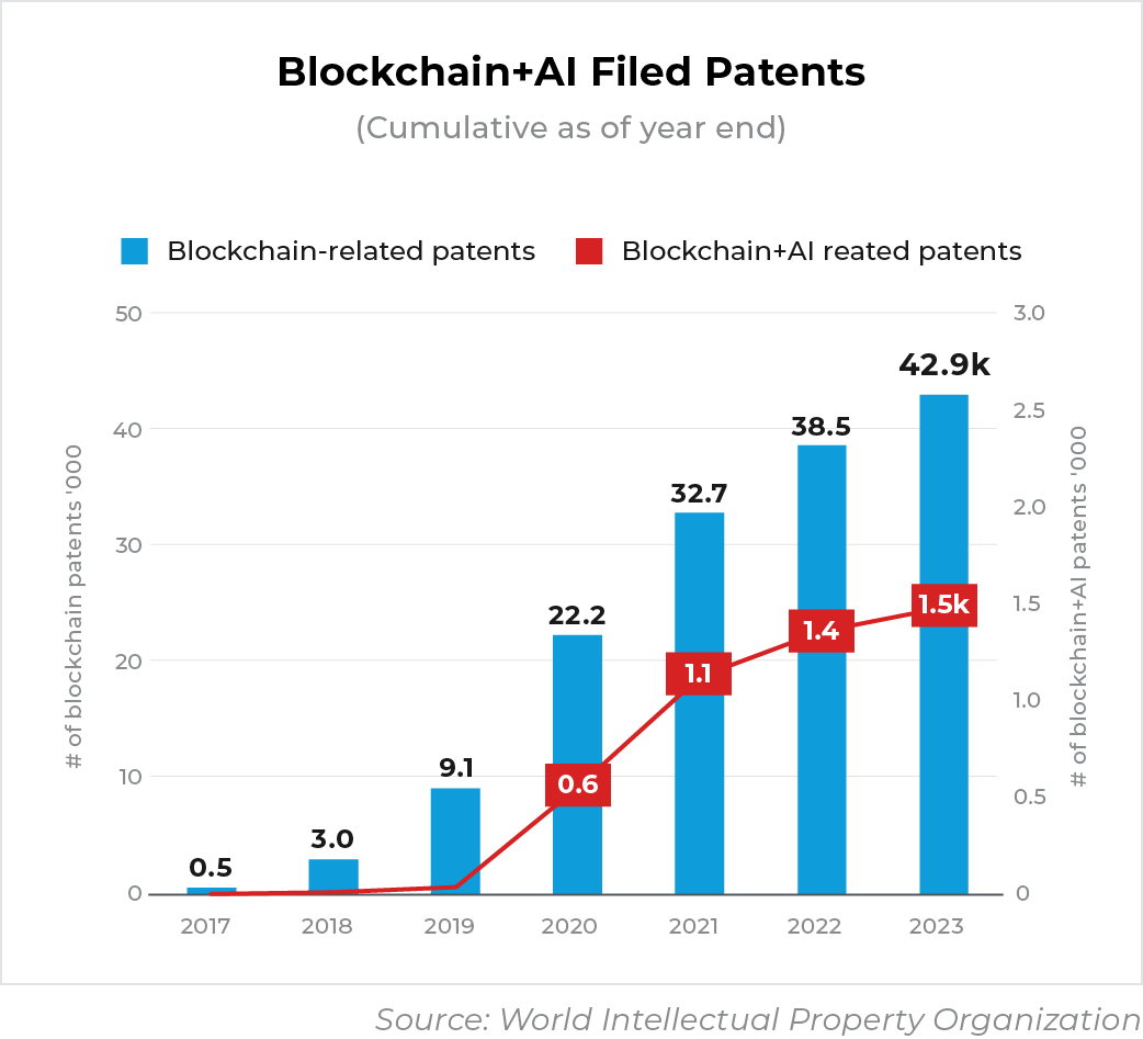 The research and development activity in the blockchain+AI field has been consistently rising over the last five years and resulted in 6.9k blockchain+AI -related GitHub repositories and 539k GitHub pull requests, 1.5k filed patents, and 5.6k research publications as of December 31, 2023.2