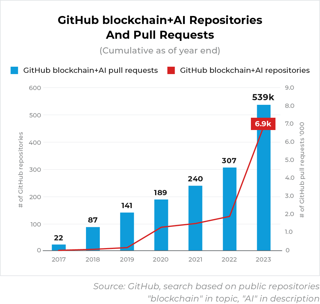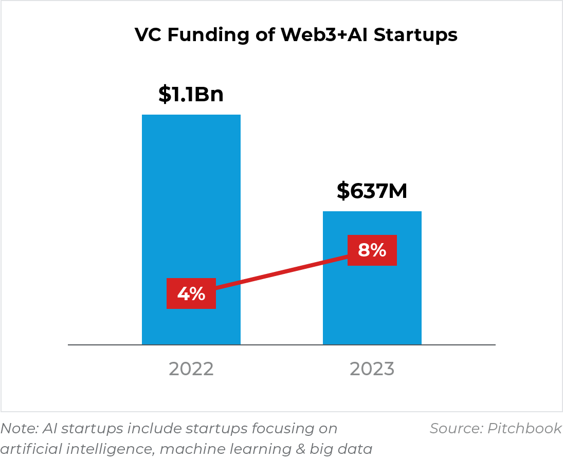 There is a wave of new startups working at the intersection of blockchain+AI and developing code writing tools, decentralized data storage, compute infrastructure for AI, content authenticity, privacy, and AI-enabled Web3 security solutions. The VC funding of the blockchain+AI startups exceeded $0.6Bn in 2023.4