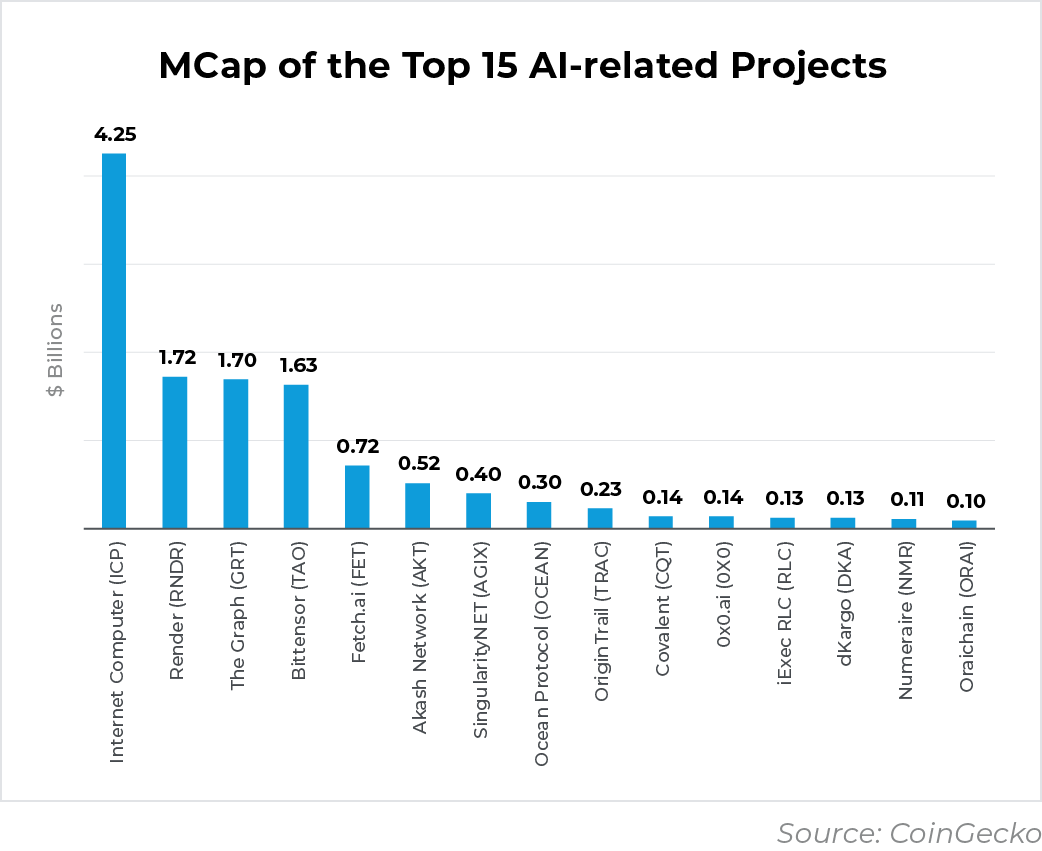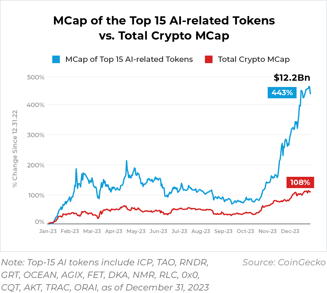 The market sentiment has been optimistic about the growth potential of AI on-chain. The market capitalization of the top 15 AI-related tokens reached $12Bn in 2023 and showed an impressive growth of 443% in 2023 compared to 108% for the total crypto market capitalization.3