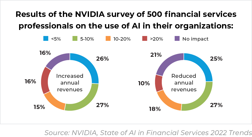 According to a 2022 survey by NVIDIA, over 75% of companies operating in the financial sector apply machine or deep learning to optimize their internal operations.2