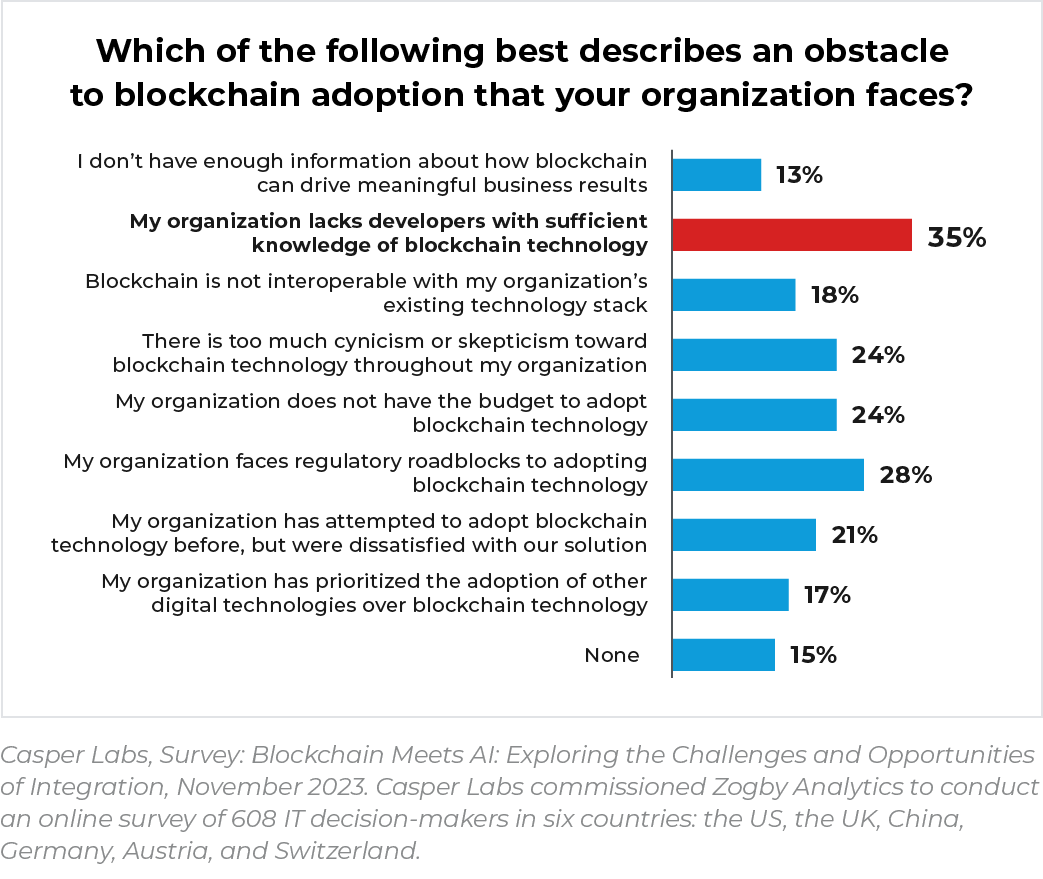 A lack of developers with sufficient knowledge of blockchain technology remains one of the main obstacles to blockchain and AI implementation.