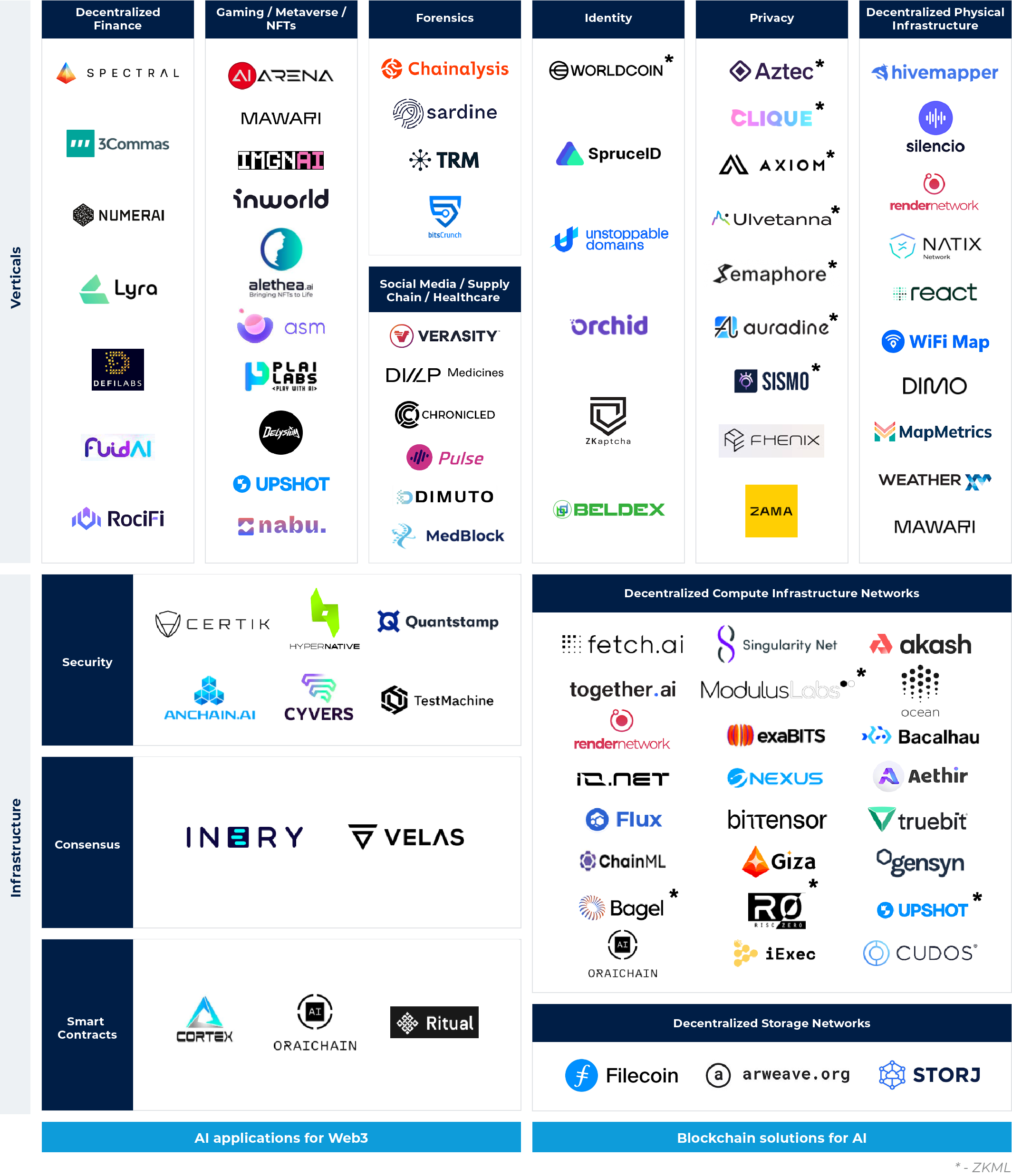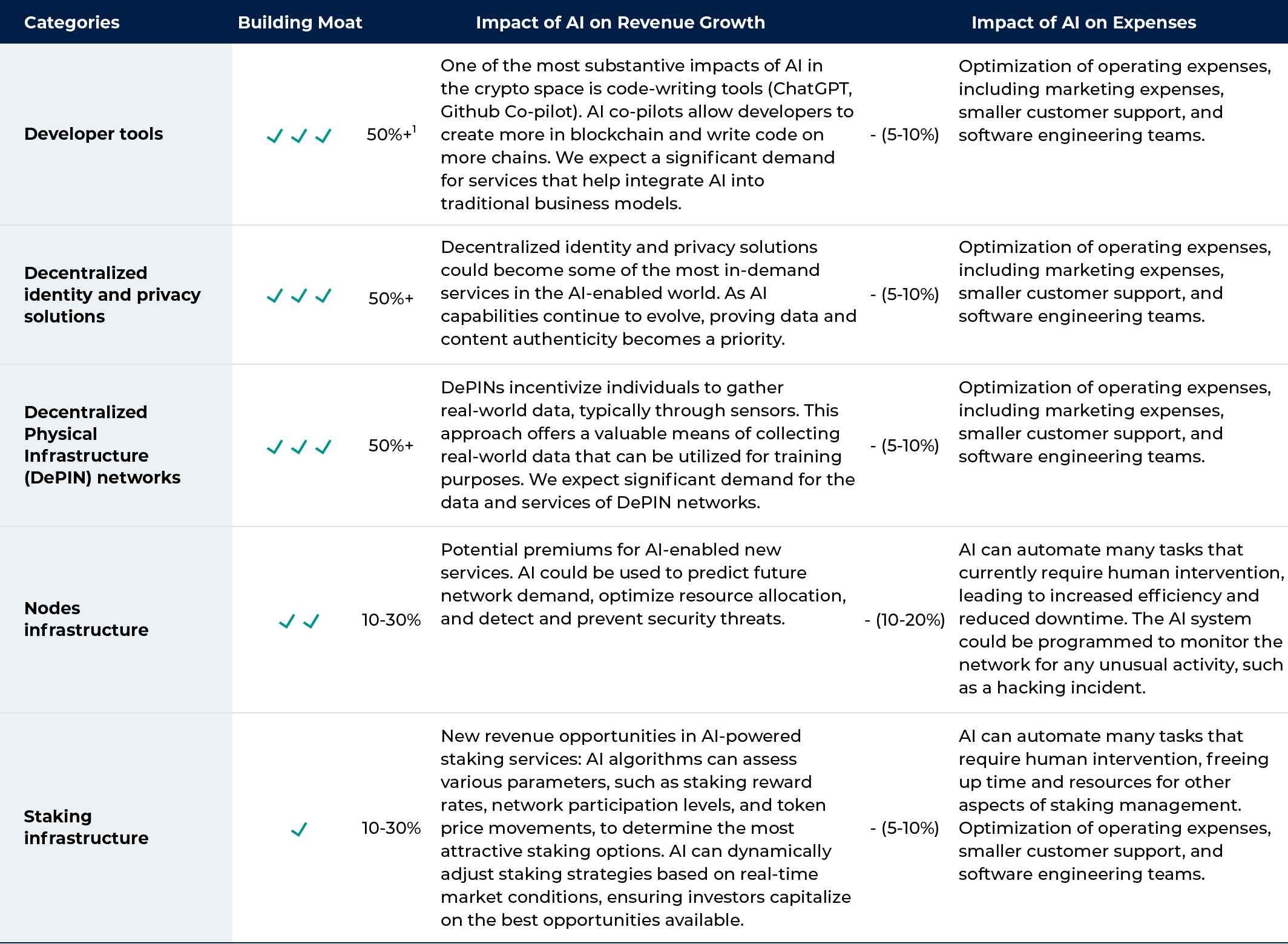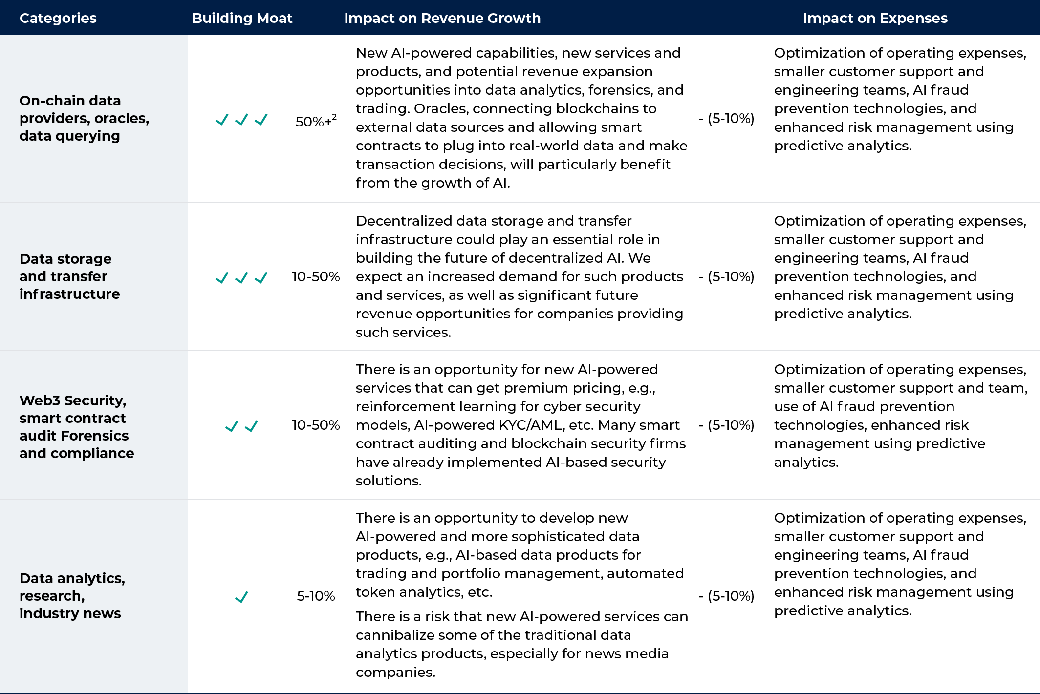 AI has the potential to revolutionize blockchain infrastructure companies, leading to increased efficiency and security of blockchain networks. Main beneficiaries: Worldcoin, Fetch.ai, Chain.ML, Risc Zero, DIMO, and others.