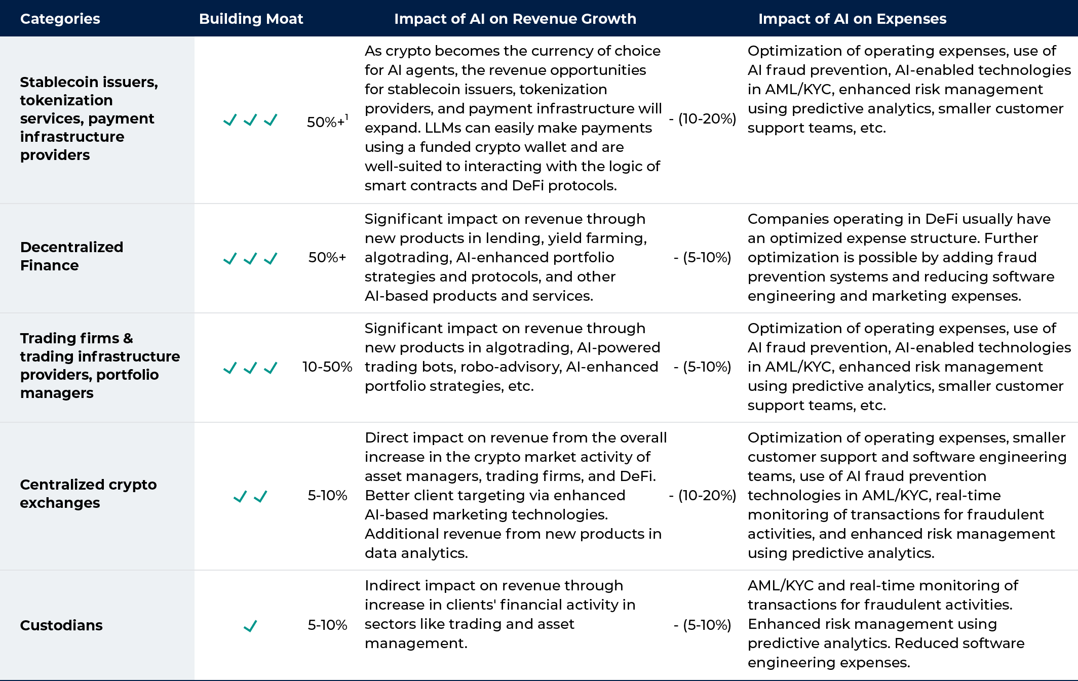 Considering the interconnected and compounding nature of AI and blockchain technologies, the effect on the economics of crypto financial services companies can be much larger than in traditional finance.