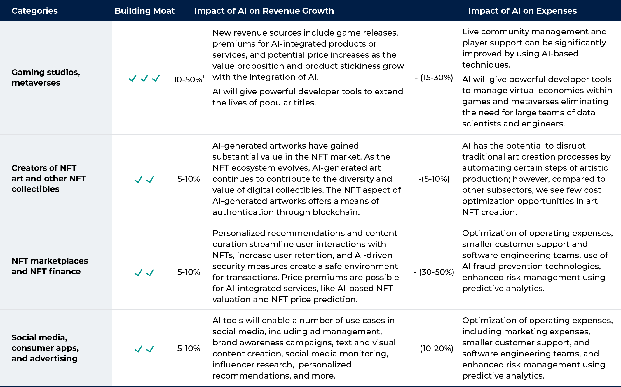 Besides driving the formation of new startups, AI technology could significantly affect existing digital asset companies by helping them to optimize expenses, increase revenues, and build moats.