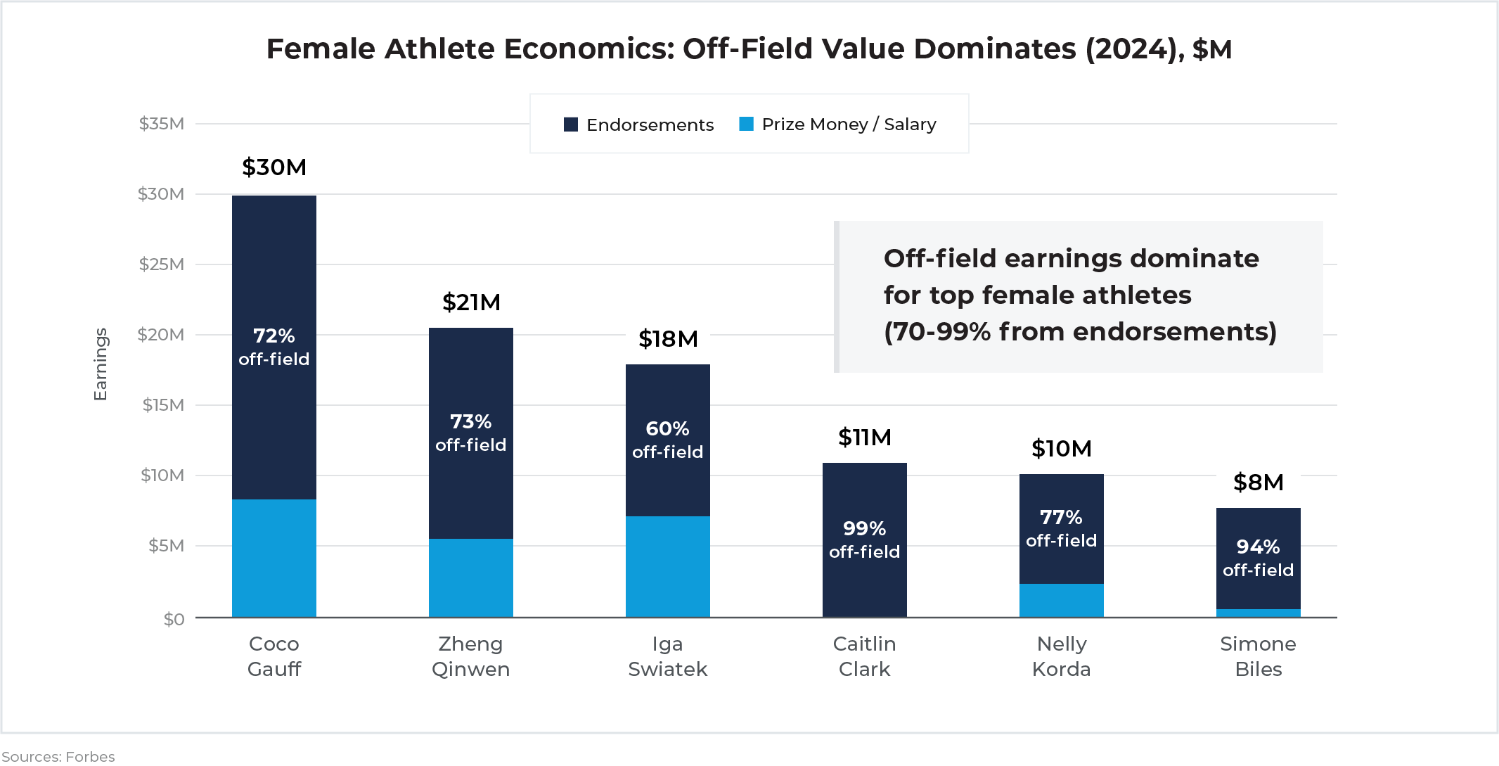 The rapid professionalization of collegiate NIL (Name, Image, and Likeness) and the "hypergrowth" of women's sports are significant forces driving the athletes’ ability to monetize their personal brands beyond traditional salaries. The NIL market alone has generated more than $1Bn in economic activity, with women accounting for 52% of the top 100 deals, according to SponsorUnited.