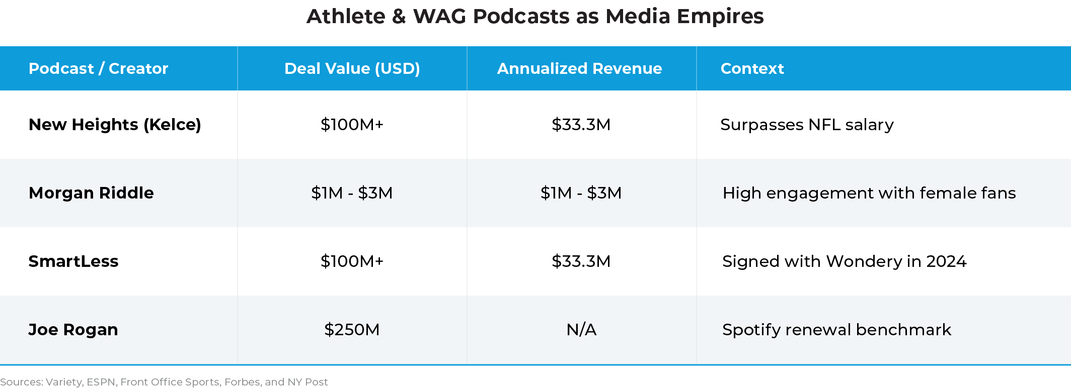 Brand Boom: The personal brand surge enables niche athletes to monetize Instagram/TikTok narratives for sponsorships beyond sports. Pros like Travis and Jason Kelce exemplify this as their own broadcasters: New Heights podcast secured a three-year, $100M+ Amazon Wondery deal - $33.3M annually, topping their NFL salaries.